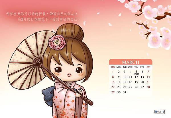 而同樣是3月份生日的創意達人兔包,則畫下了充滿東洋風的生日祝福卡,希望他有天可以背起行囊,帶著自己的信心,在3月的日本櫻花下,感到幸福的自己。