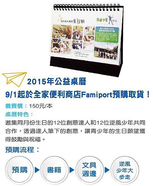 2015年公益桌曆,9/1起在全家便利商店FamiPort預購取貨